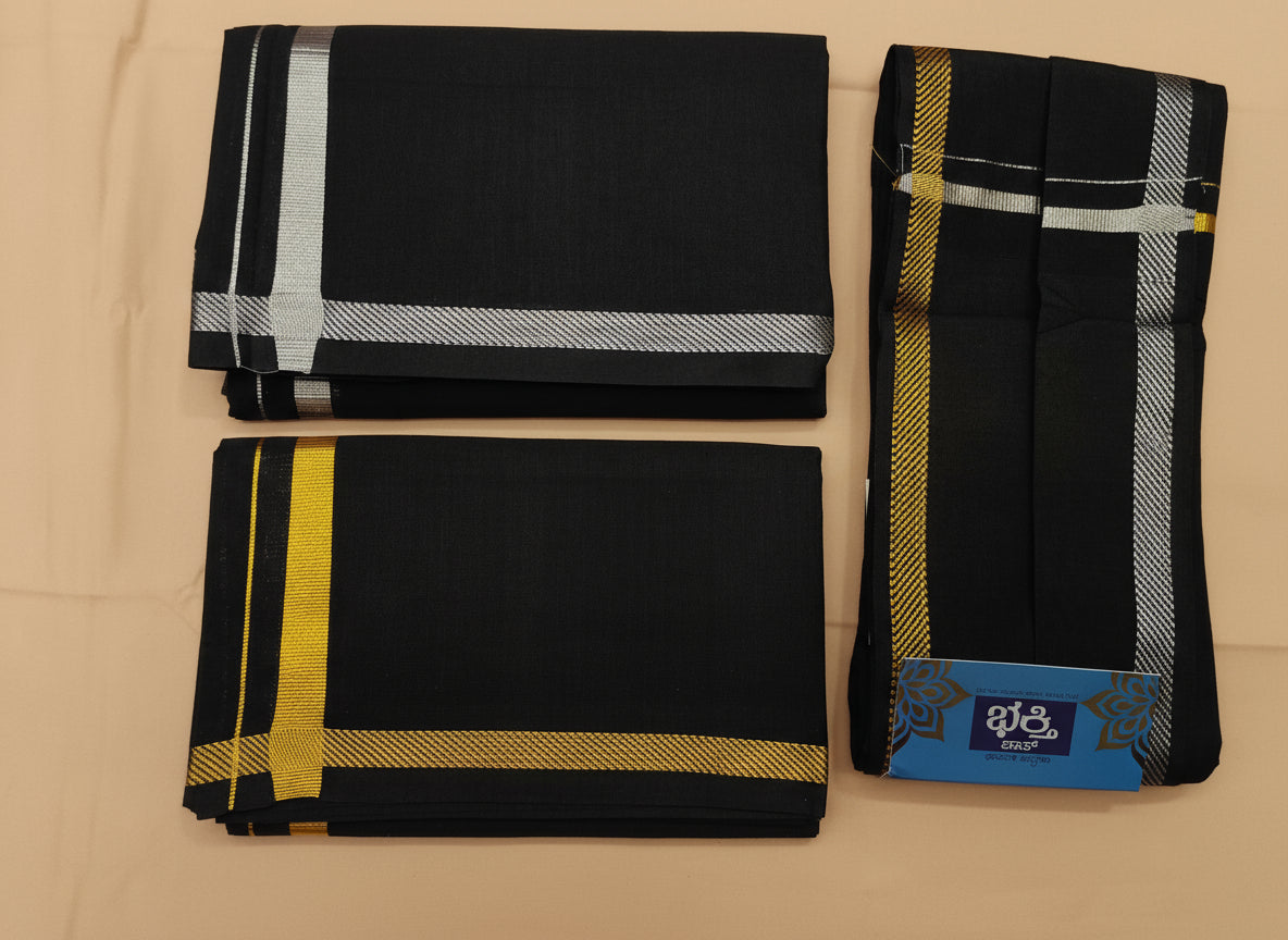 Men 100% Cotton Single Layer Black Dhoti and Angavastram with Designer Small Border