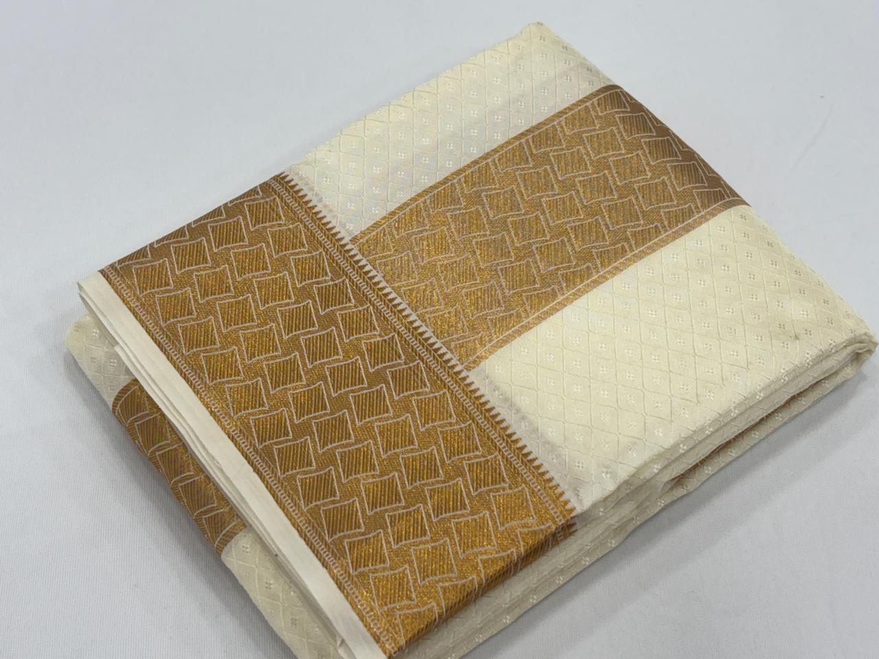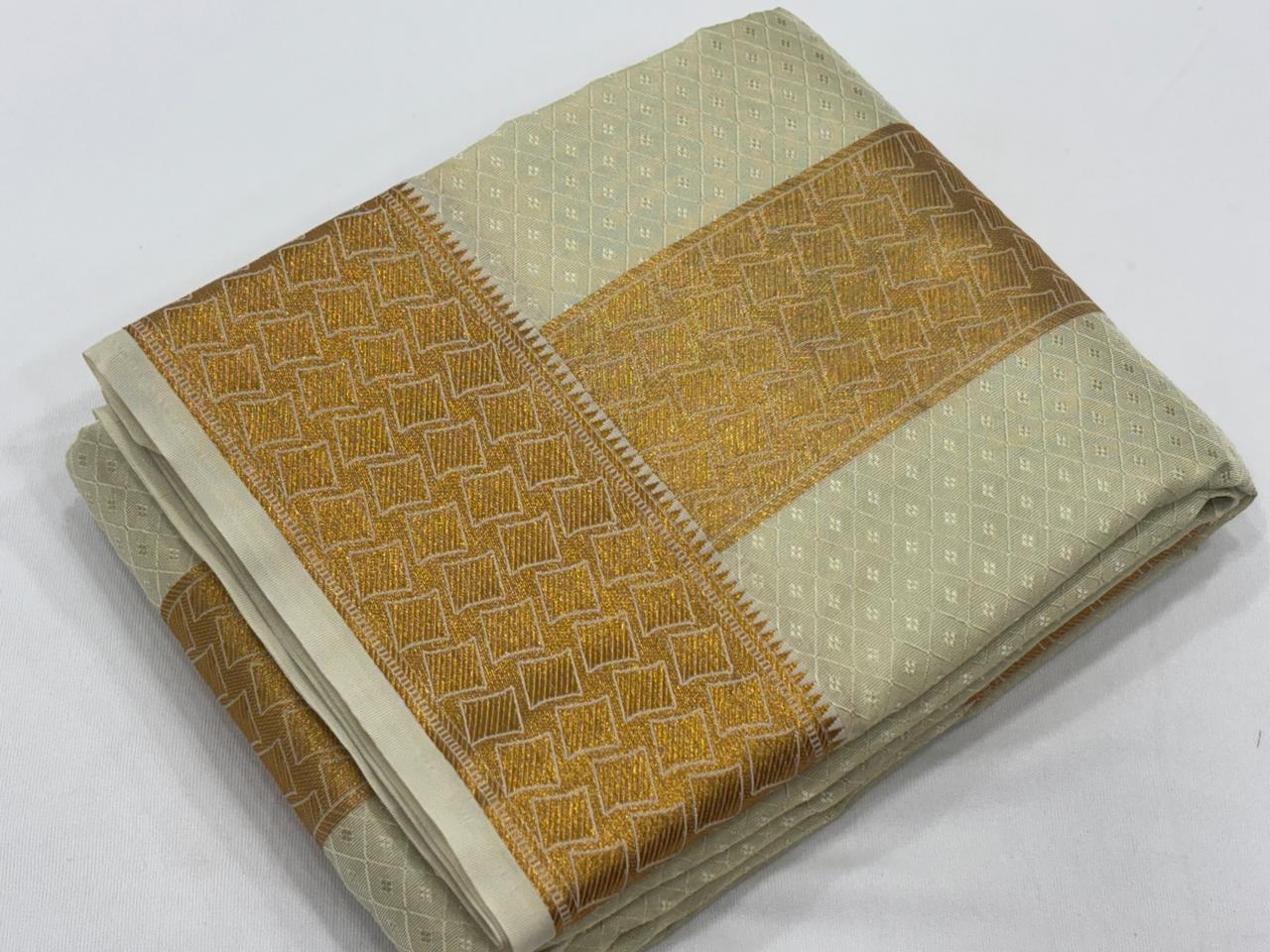 Men Luxury Art Silk Tissue Jacquard Dhoti & Towel Set with 4" inch Gold Jari Fancy Border Roopakam